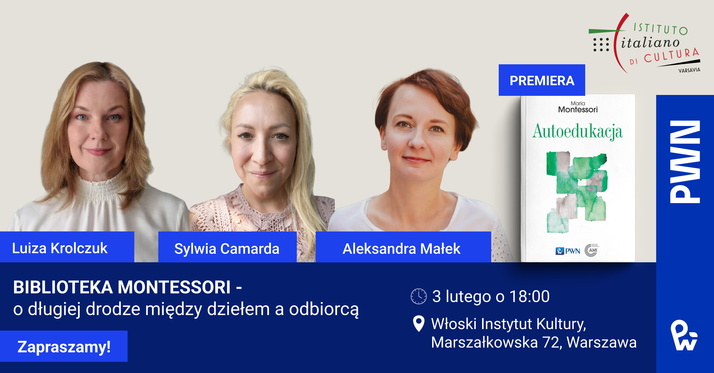 3 lutego o godz. 18.00 we Włoskim Instytucie Kultury odbędzie się spotkanie poświęcone wyjątkowemu przedsięwzięciu wydawniczemu – serii Biblioteka Marii Montessori. Wydarzenie zatytułowane „Biblioteka Montessori – o długiej drodze między dziełem a odbiorcą” będzie okazją do rozmowy o ideach Marii Montessori, ich recepcji w Polsce oraz o wieloletniej pracy, dzięki której polscy czytelnicy po raz pierwszy otrzymali pełny dostęp do jej pism.